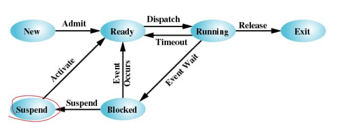 러닝 -> 레디/서스펜드 - 블락/서스펜드 상태중에서도 우선순위가 매우높은 프로세스가 이벤트가 발생하여 바로 메모리로 올라와야 하는데 메모리가 부족한경우 swap -out 당할 가능성이 있다.