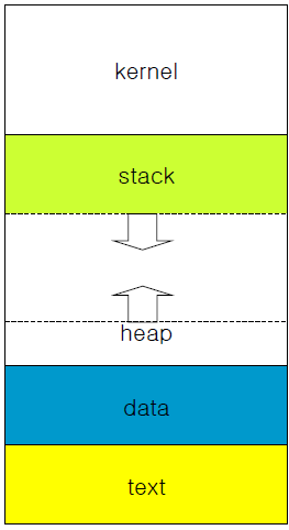 여기서 스택의 위치는 다음 그림을 통해 알수있습니다. 이 스택영역은 로컬변수와 함수호출시의 콜링어드레스를 쌓아둡니다.