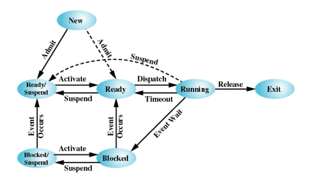ready,blocked -> exit 어떤 상태에서도 exit 할수 있음, (예, 부모 프로세스가 자식을 죽일떄)
