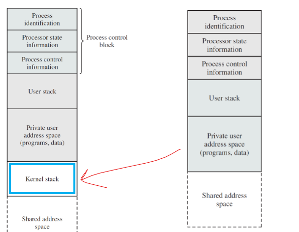만약 모드 스위칭이 이루어진다면 커널 스택이 들어간 유저 스페이스로 구성된다.
