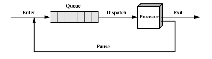 낫 러닝인 상태의 프로세스들이 큐의 형태로 기다리고 있다가 디스패쳐가 타임아웃이 발생할때마다 맨앞으 프로세스를 processor에 넣어준다.