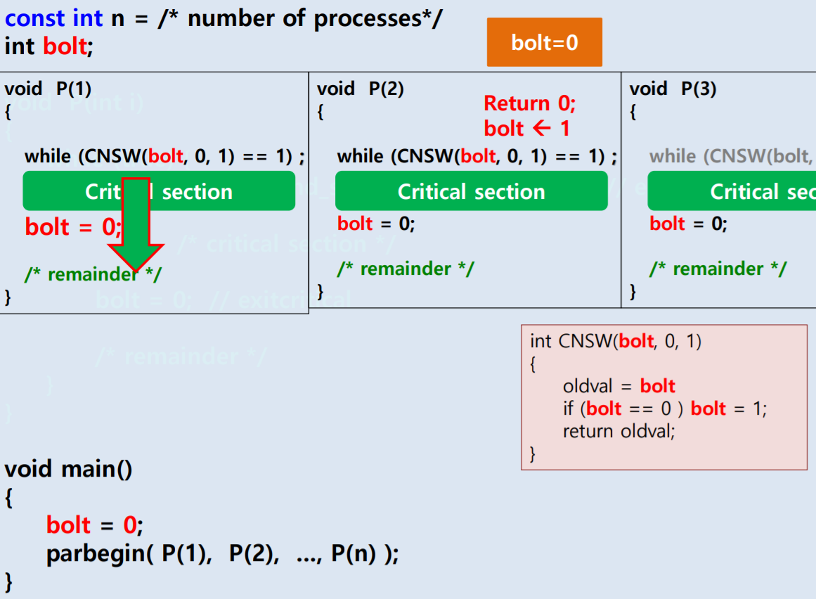 장점 : compare & swap 을 사용하면 여러개의 크리티컬 섹션이 보장됩니다 (한섹션당 하나의 고유한 글로벌 변수를 선언, 만약 크리티컬 섹션이 3개라면 bolt와 같은 변수도 3가지), 그리고 멀티 프로세서 환경에서도 사용이 가능합니다. 글로벌 변수는 메모리의 영역에서 공유되는 것이기 때문에 프로페서는 혼동을 겪지 않습니다.