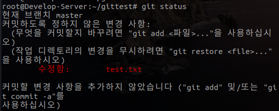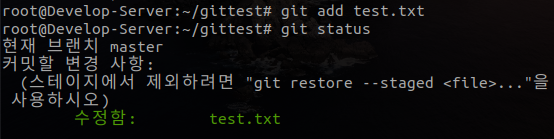 이 수정된 파일을 관리대상 즉 스테이지로 만들기 위해 git add 명령을 다시 실행해주고 상태를 확인하면 아래와 같이 수정함 이라는 글씨가 초록색으로 바뀌고 커밋할 변경사항에 추가된것을 확인할수 있습니다.