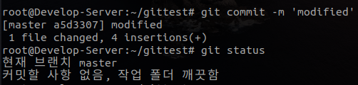 이 스테이지를 다시 git commit 명령을 통해 커밋해줍니다. 저는 -m 옵션으로 'modified' 라 메세지를 붙였습니다.