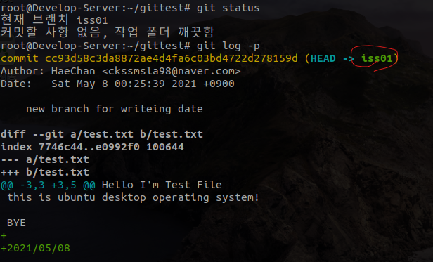 새로운 가지에서 커밋된것을 확인할수 있죠!