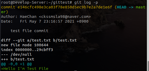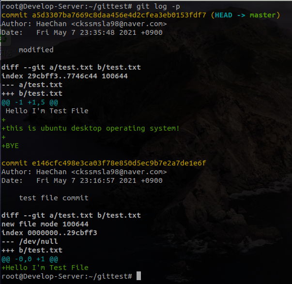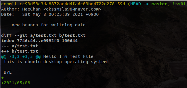 이렇게 본다면 초록색 글씨가 제가 파일에 입력한 내용이고 기본 정보들은 잘 나오는거 같은데 커밋 과정들은 이해하기 힘든 부분들이 있네요 이러한 정보들은 나중에 깃허브 저장소에서 파일을 올려 관리하면 조금더 분명하게 수정된 부분을 확인할수 있습니다.