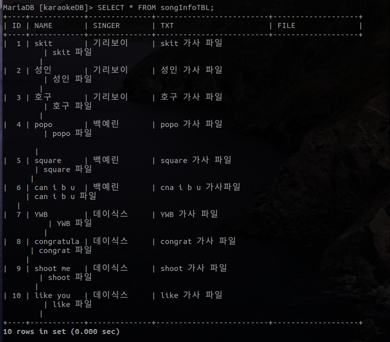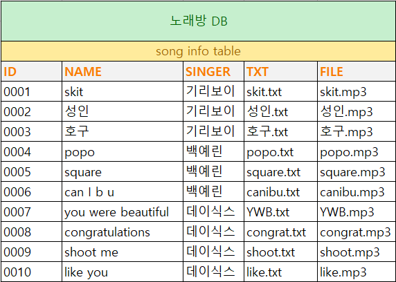이로서 파일을 포함시켜 노래방 데이터 베이스와 얼추 형식이 비슷한 테이블을 만들어 보았습니다.