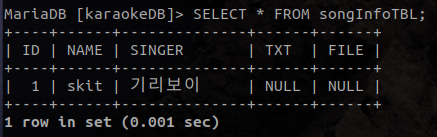 그리고 나서 skit 이라는 노래의 정보를 한행을 테스트삼아 INSERT 해주었습니다.