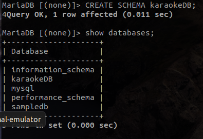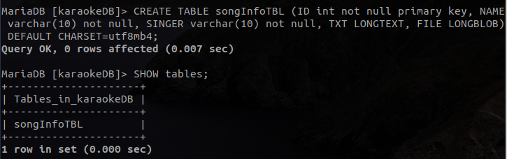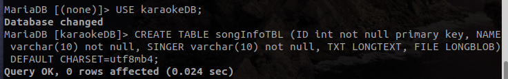 먼저 karaokeDB라는 이름으로 노래방DB를 만들어 주었습니다.