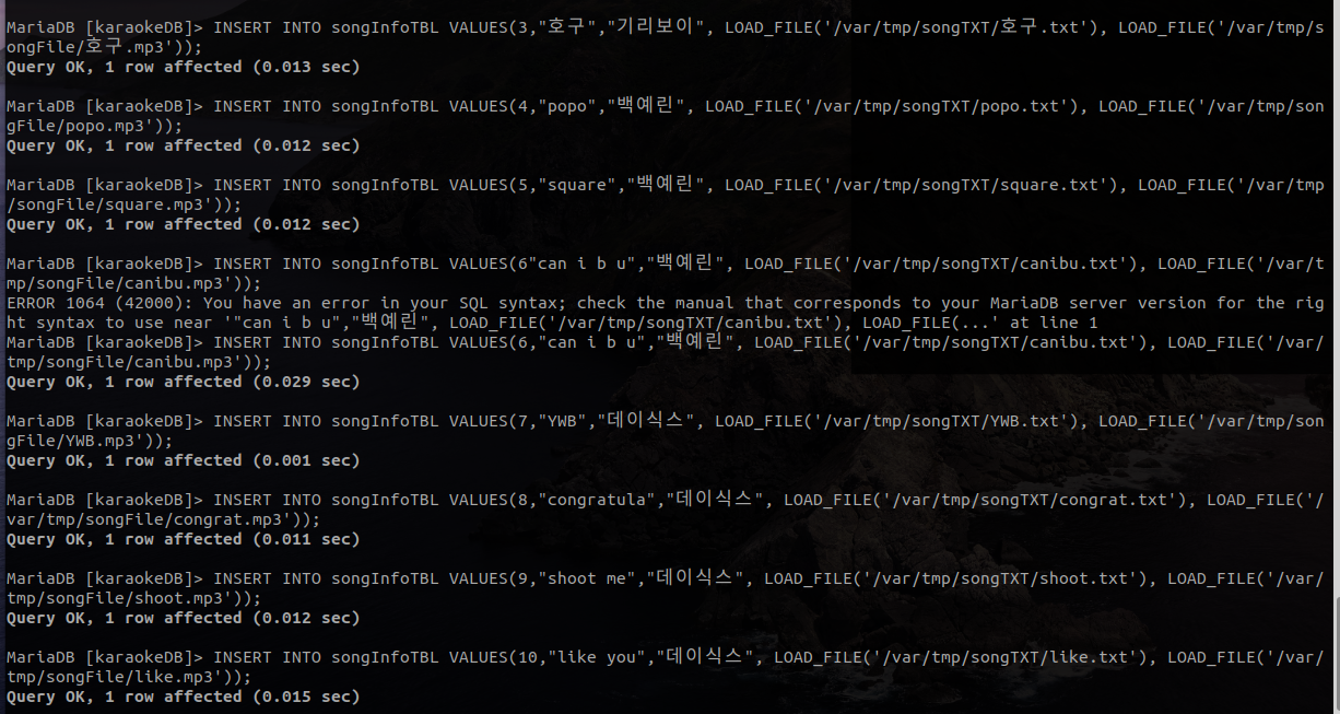다섯번째는 노래 파일이 있을것입니다. 노래파일또한 데이터 행에 포함이 되어야 합니다.