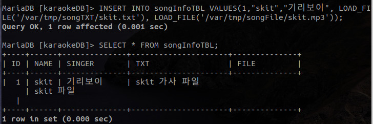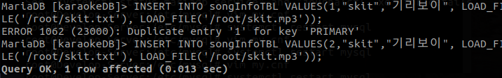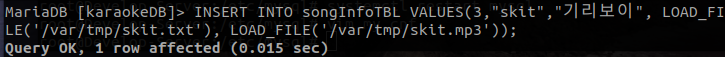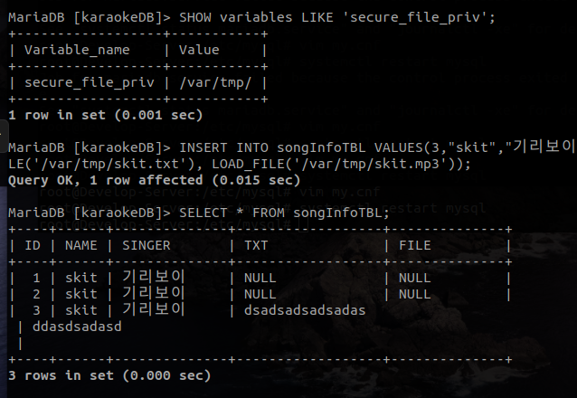 그래서 /var/tmp디렉터리로 파일을 옮겨준 이후 다시 INSERT 를 해주니 결과를 잘 확인할수 있었습니다.