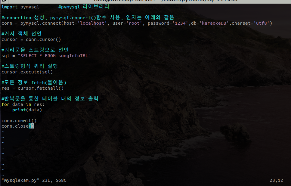 사실 위에서 세번째 줄에 커넥션을 만드는 라인이 가장 중요하고 나머지는 그냥 라이브러리 내의 함수를 사용한것입니다.
