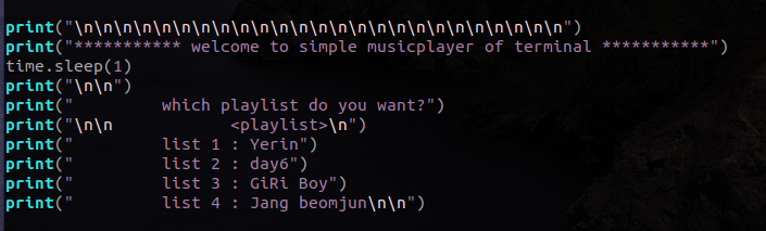 먼저 환영한다는 메세지를 출력후 1초의 딜레이후 음악 리스트를 출력할수 있도록 하였습니다.