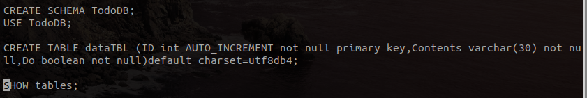 1. TodoDB 라는 이름으로 스키마(데이터 베이스 생성)