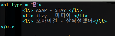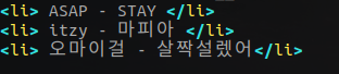 이번에는 목록, 즉 리스트에 대하여 다루어 보겠습니다. 위의 예제에서 맨위에 다른 곡들의 리스트를 더 추가해보려 할때 사용하는 태그는 <li> </li> 입니다. 코드는 아래와 같습니다.
