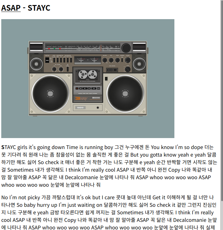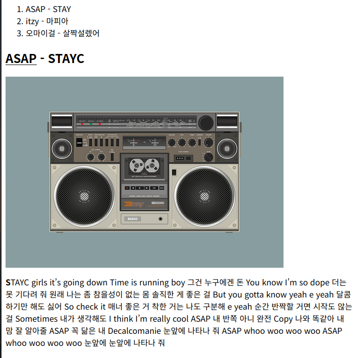 지난번 포스팅때 까지 우리는 좋아하는 노래의 가사 정보를 출력하는 웹페이지에 여러가지 태그를 추가하여 보기 좋게 만들어 보았습니다. <p> 태그를 이용한 문단 나누기 까지 한 결과가 아래와 같았죠