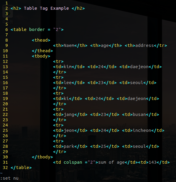 line 6, 32 테이블 태그의 기본 선언입니다. <table> </table> 태그를 통해 태그안의 내용이 테이블을 구성하는 요소임을 나타냅니다. 속성으로 들어간 border="2" 는 테이블을 구분하는 구분선들의 굵기를 나타냅니다.