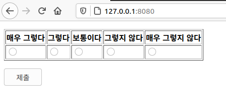 radio 의 경우 강의 평가 또는 mbti 성격유형 검사를 할때 사용되는 예입니다. 지난 포스팅의 table 태그와 함께 사용한 결과하면은 아래와 같습니다.