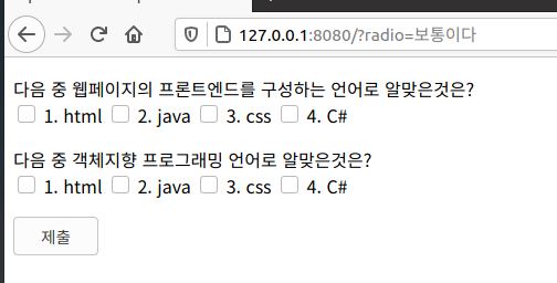 여러개의 항목들중 하나만 선택할때는 주로 radio를, 여러개의 항목들중 다중선택을 할때는 주로 checkbox를 사용합니다.