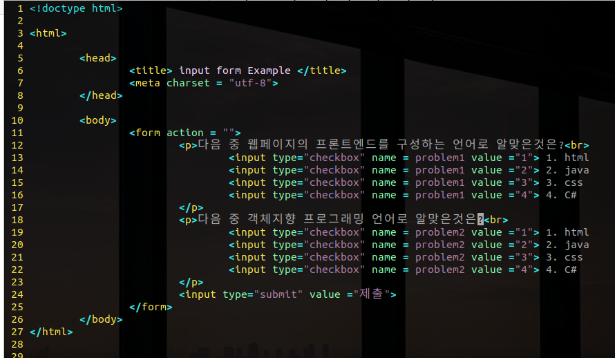 line 11, 15 : <form> </form> 태그를 이용한 form을 선언해주었고 action 값은 부여하지 않았습니다.