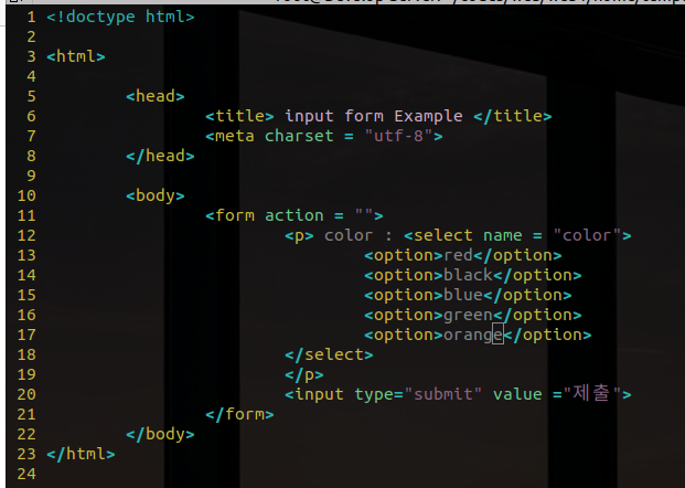 line 12, 18 : form 태그의 하위로 <select> </select>라는 콤보박스 태그를 선언해주었습니다. 이 태그는 자식태그로 <option> 태그를 갖습니다. name 속성값을 color 로 지정하였고 submit 타입의 인풋을 통해 서버로 제출한 결과는 다음과 같습니다.