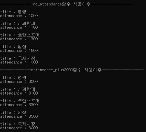 Step4) inc_attendance() 함수를 선언하고 메인에서 호출하여 영화 두세개의 관객수 변경하기