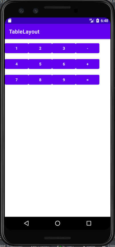 테이블 레이아웃의 경우 행과 열을 설정할수 있는 시트형 레이아웃입니다. 저의경우 컨텐츠의 배치가 코드를 실행하기전의 화면에 대한 구상이 Linearlayout에 비해 간편했습니다. 정확한 위치 까지는아니어도 행과 열을 통한 위치를 구상할수 있었기 때문입니다. 테이블 레이아웃을 통해 만들어볼 UI는 아래와 같습니다. (계산기 어플의 인터페이스를 구상한 것인데 당연히 java코드를 동작관련하여 짜지 않았기 때문에 계산기의 기능은 없는 껍데기입니다)