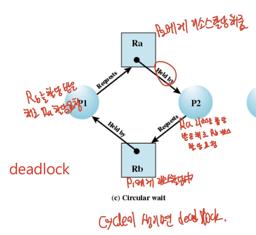 hold and wait 상태가 위의 그래프처럼 하나이상의 고리를 형성한것을 말합니다.