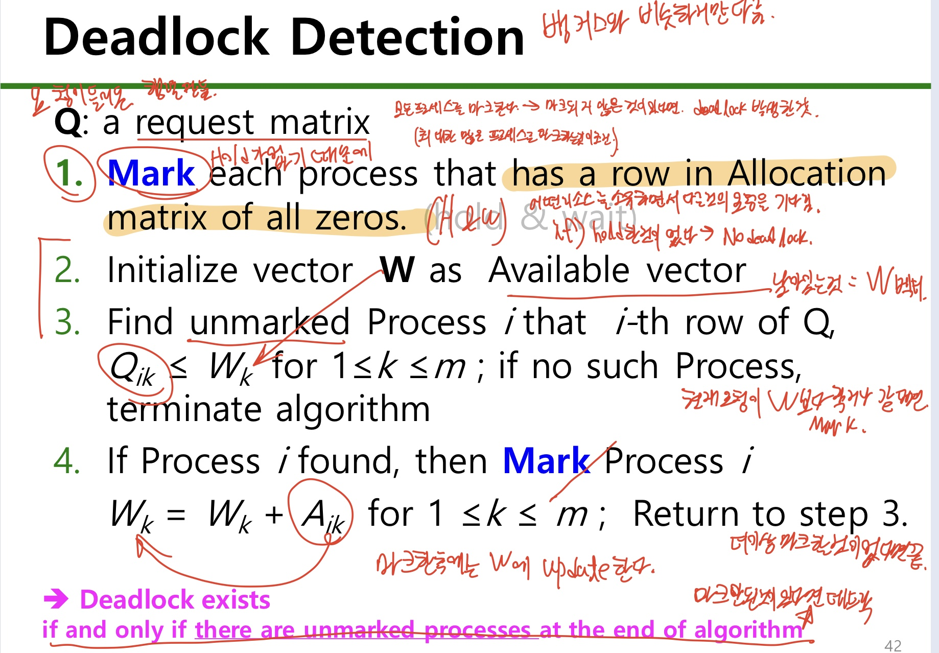 뱅커스 알고리즘과 비슷하지만 다른 방법을 사용합니다. 바로 마크를 이용하는것인데요, 전체 검사를 돌린후 마크가 있다면 정상 마크가 없다면 데드락 발생한 프로세스 입니다. 자세한 내용은 아래의 필기와 같습니다.