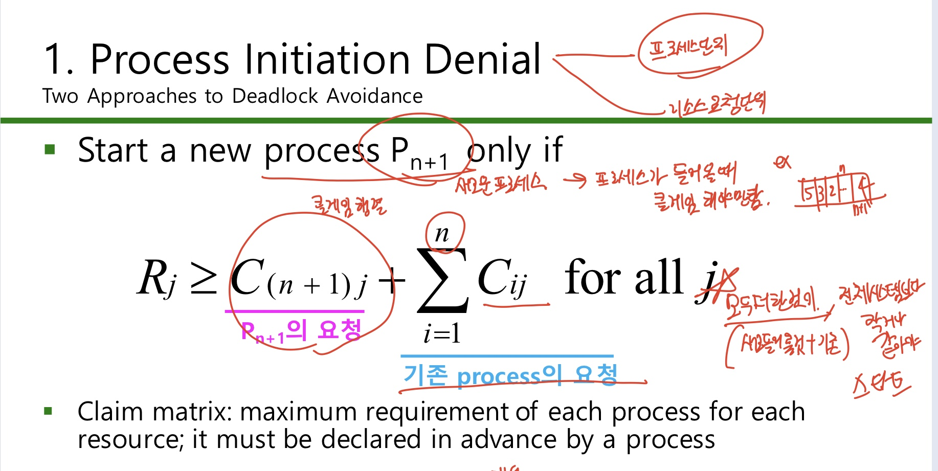 이 방법은 데드락에 관해 두가지 접근 방식이 있습니다. 첫번째로 데드락을 발생시킬만한 프로세스를 아예 시작하지말라는 방식, 두번째로 데드락을 발생시키만한 요청을 허가하지 말아라 가 있습니다.