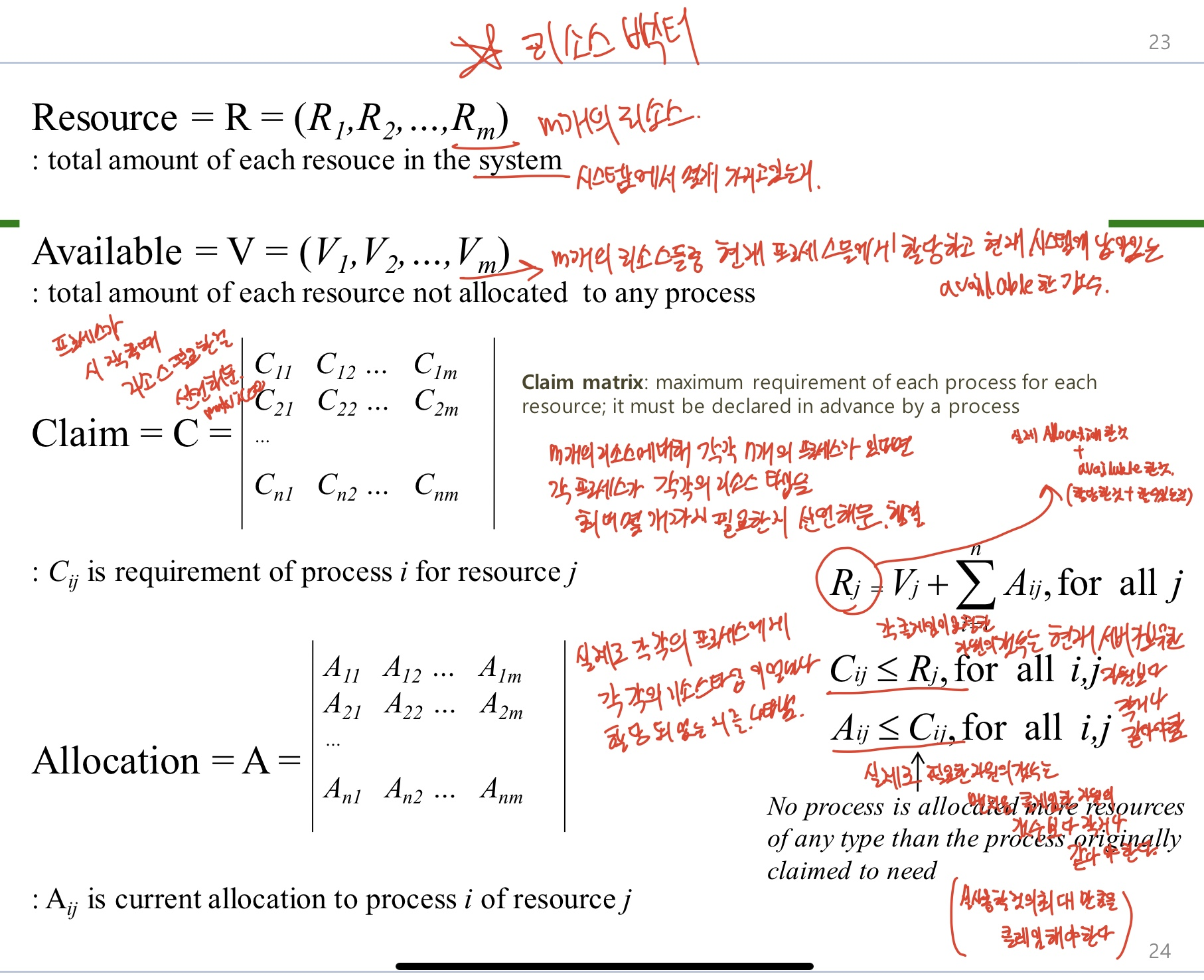 정말 핵심만 뽑아보면 클레임 백터와 전체시스템이 보유한 리소스 벡터 R을 비교해서 해당 클레임을 수행했을때 데드락이 발생할까? 만 생각하며 계산하면 됩니다.