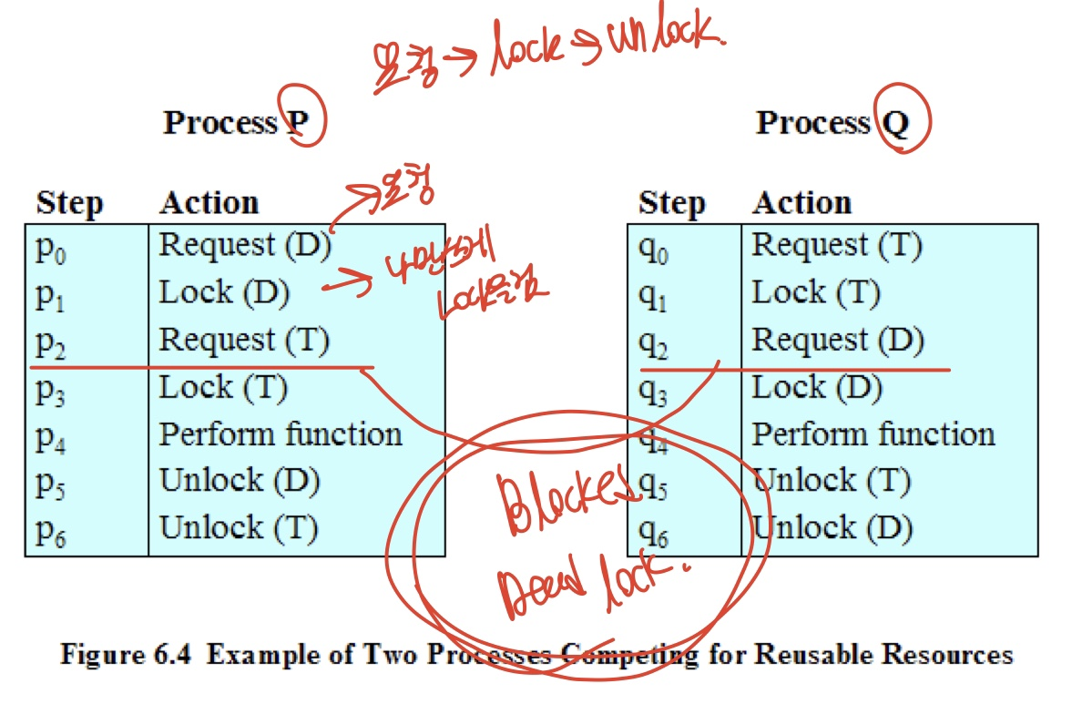 - 재사용 가능한 리소스의 경우 Processors, I/O channels, main and secondary memory, devices, and data structures such as files, databases, and semaphores 등이 있습니다.