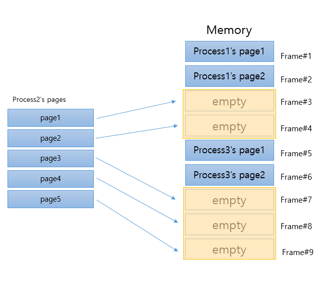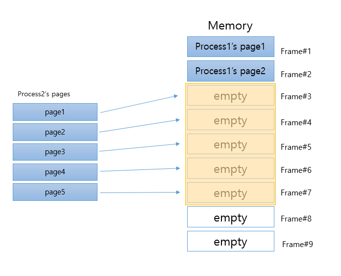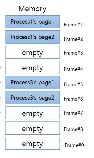 아래와 같이 프로세스를 쪼갠 페이지의 갯수만큼 연속적인 공간의 프레임이 있다면 문제는 생기지 않을것입니다.