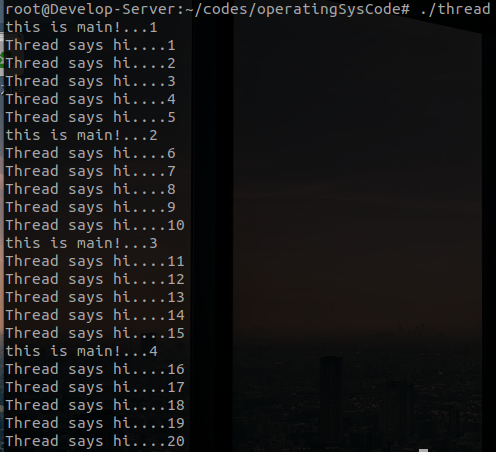 위를 이용하여 메인문에서 5초 간격으로 4번의 출력문이 실행되고 1초간격으로 쓰레드에서 20번의 출력문이 실행되는 코드를 만들어 본다면 다음과 같습니다.