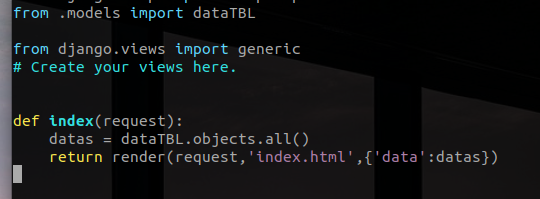 view.py 파일에 데이베이스의 테이블 클래스를 import 시킨후 다음과 같은 코드를 통해 데이터를 템플릿의 html 파일로 보냅니다
