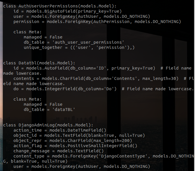 그다음은 연결된 데이터베이스에서 사용할 테이블을 클래스로 따로 빼와 models.py에 선언해 주어야 하는데 이는 장고프레임워크의 ./manage.py inspectdb라는 좋은 디비 감지 명령을 이용하면됩니다.
