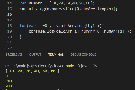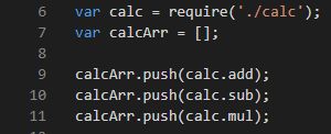 이를 이용해 초기화되지 않은 함수베열 calcArr를 선언하고 이전포스팅에서 만들어본 모듈의 함수들로 배열을 초기화한다면 다음과 같습니다.