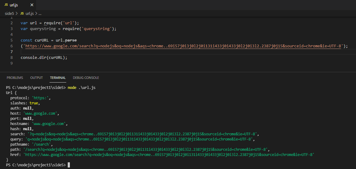 이번 포스팅에서는 url을 node.js의 객체로서 반환하여 다루어 볼것이고 프로그램 코드 내에서 url의 각 정보에 어떻게 접근하고 어떻게 출력하는지 다루어 보겠습니다