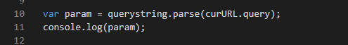 파라미터를 의미하는 param이라는 변수명으로 해당url의 쿼리속성만 querysting의 parse함수를 통해 객체로 만들어 주었습니다 이후 콘솔을통해 정보를 확인해보면 다음과 같습니다.