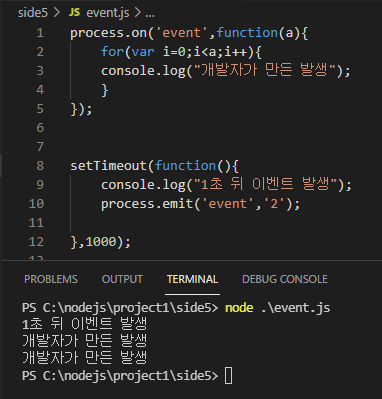 위의 예제는 emit 함수를 이용해 이벤트를 발생시키는것입니다. event라는 이름의 이벤트 발생시 on메소드로 만든 이벤트 리스너함수가 실행됩니다. 이때 함수 실행에 필요한 인자가 있다면 그값을 이벤트 이름 뒤에 ,(콤마)로 구분하여 넣어줍니다.