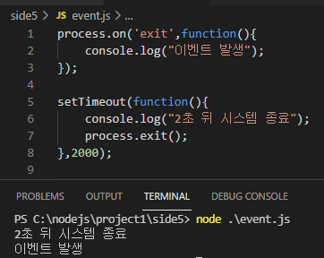 해당 코드는 on이라는 프로세스모듈의 메소드를 이용하여 리스너를 작성하고 setTimeout 함수내에 이벤트를 발생시켜 결과를 확인하는것입니다. exit라는 이벤트의 리스너는 1번라인부터 3번 라인에 해당하고 이벤트의 발생은 7번라인에 해당합니다.