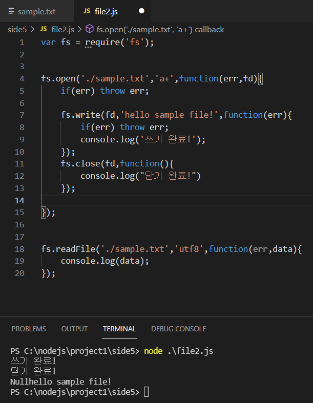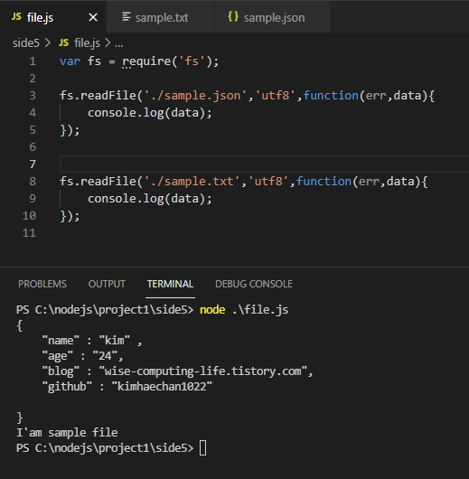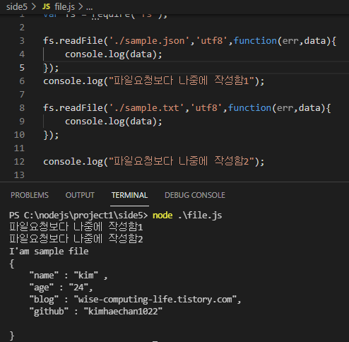비동기식은 파일시스템에 요청을 보낸후 이후 코드를 처리하고 있다가 이벤트가 발생하면 이를 처리하기때문에 중간중간에 만약 다른 코드를 넣는다면 그코드가 먼저 수행되고 파일시스템 이벤트가 처리되는것을 확인할수 있습니다. 아래에 예를 첨부하겠습니다.