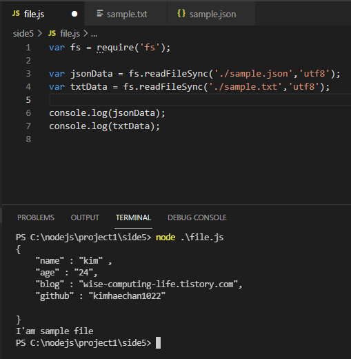 그럼 바로 동기식 IO 파일시스템을 이용해서 텍스트파일과 Json 파일을 콘솔에 출력해 보겠습니다.