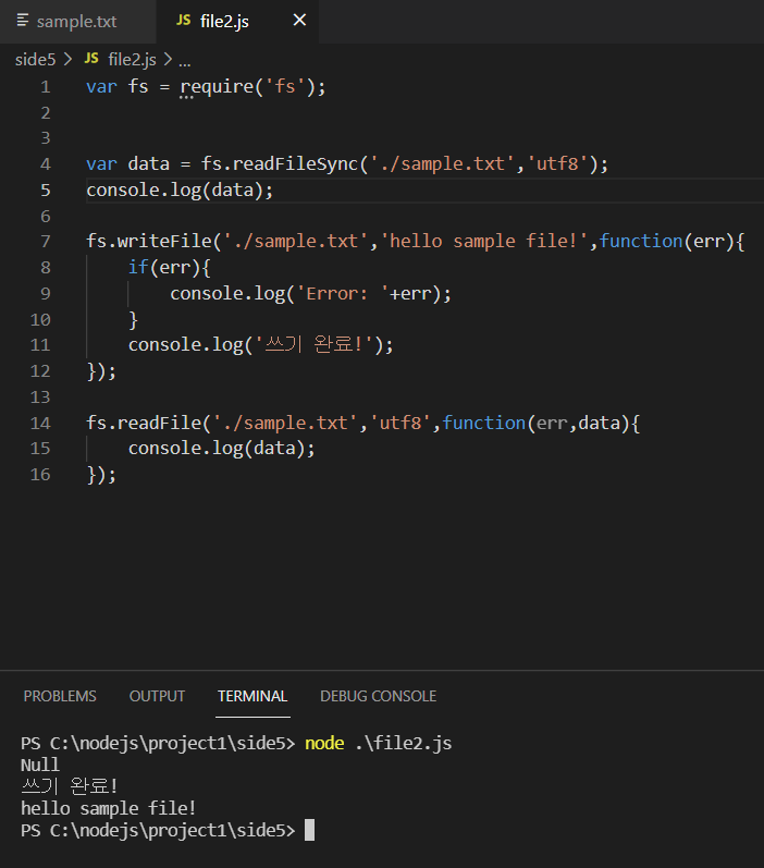 해당코드는 동기식 read를 통해 비동기식 write가 발생하기 이전에 파일의 내용을 출력하고, write이후에는 비동기식 read를 통해 변경된 내용을 콘솔에 출력해주는 예제 입니다.