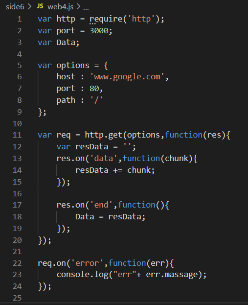 아래의 코드가 http모듈의 get 메소드를 사용하여 웹페이지의 데이터를 가져온 예입니다.