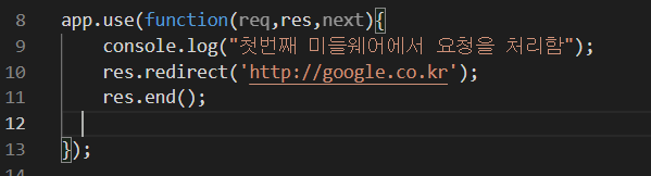 3. redirect() 메소드를 사용하면 다른 페이지로 이동할수 있습니다. 이를 이용해 구글웹페이지로 이동하는 미들웨어를 작성한다면 다음과 같습니다.