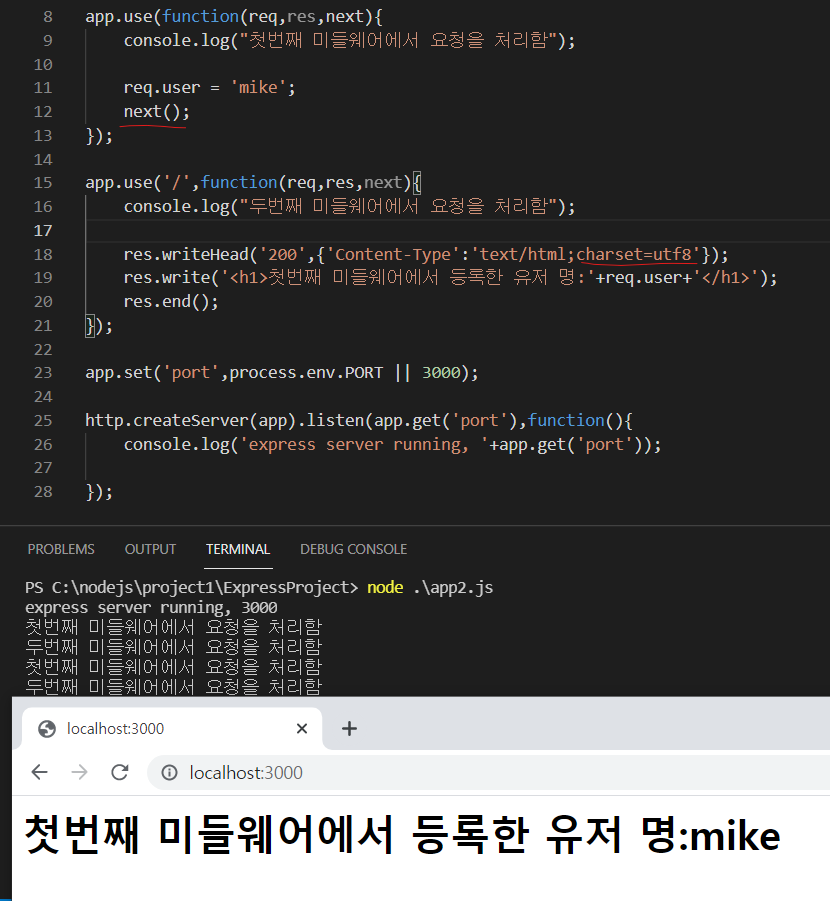 이번에는 두개의 미들웨어를 사용하는 예제를 다루어 보겠습니다.