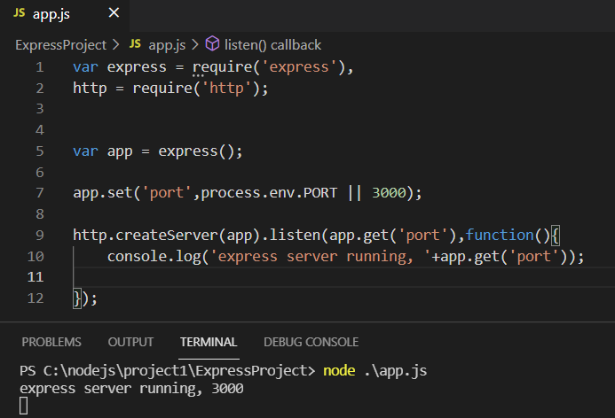 http 모듈에서도 서버객체를 만들어 그안의 listen 메소드를 호출하여 웹서버를 시작했습니다. express 모듈도 마찬가지 입니다. 다만, 포트를 set 메소드를 통해 app객체내에 초기화 되어있는 값으로 해주어야하기 때문에 가져올때는 get 메소드를 사용합니다.