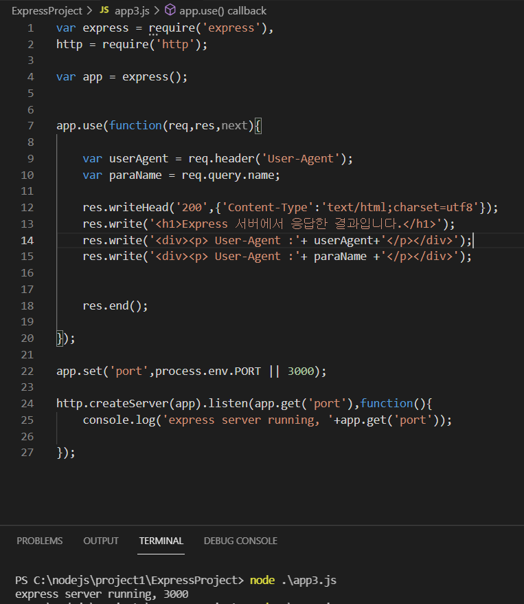 1번 라인에서 express라는 변수로 express모듈을 초기화 해주었습니다. 그후 app 이라는 변수로 express객체를 생성해 주었습니다.