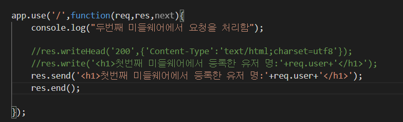 1. send는 응답 데이터를 좀더 간단하게 전송하기위해 express에서 추가된 것입니다. (html문자열, 버퍼객체, Json객체 등 전송가능) 앞서 다루었던 예제의 두번째 미들웨어에서 send를 적용한다면 아래와 같습니다.